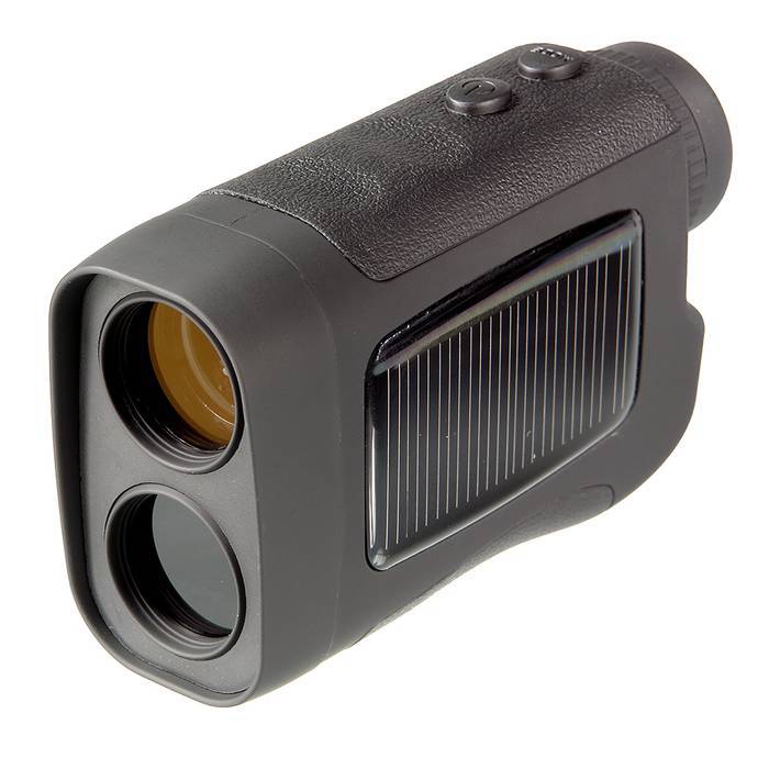 Длительное нажатие изменяет режим измерений с ярдов на метры. Результаты работы и параметры режимов работы, выводятся в поле зрения прибора на ЖК-дисплей. Линии и надписи тонкие и совершенно не мешают наблюдению. Если батарейки нет, а аккумулятор солнечной батареи сел, дальномер можно использовать просто в качестве монокуляра с увеличением 6х (ближняя точка фокусировки - 5 метров). Окуляр с удаленным выходным зрачком, с возможностью диоптрийной подстройки. Выдвигающийся наглазник для удобства наблюдения в обычных или солнцезащитных очках.