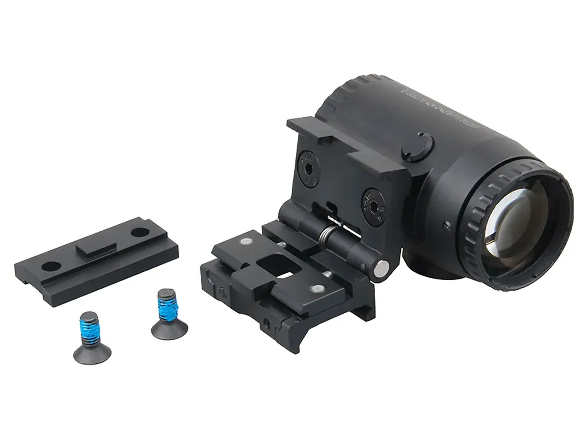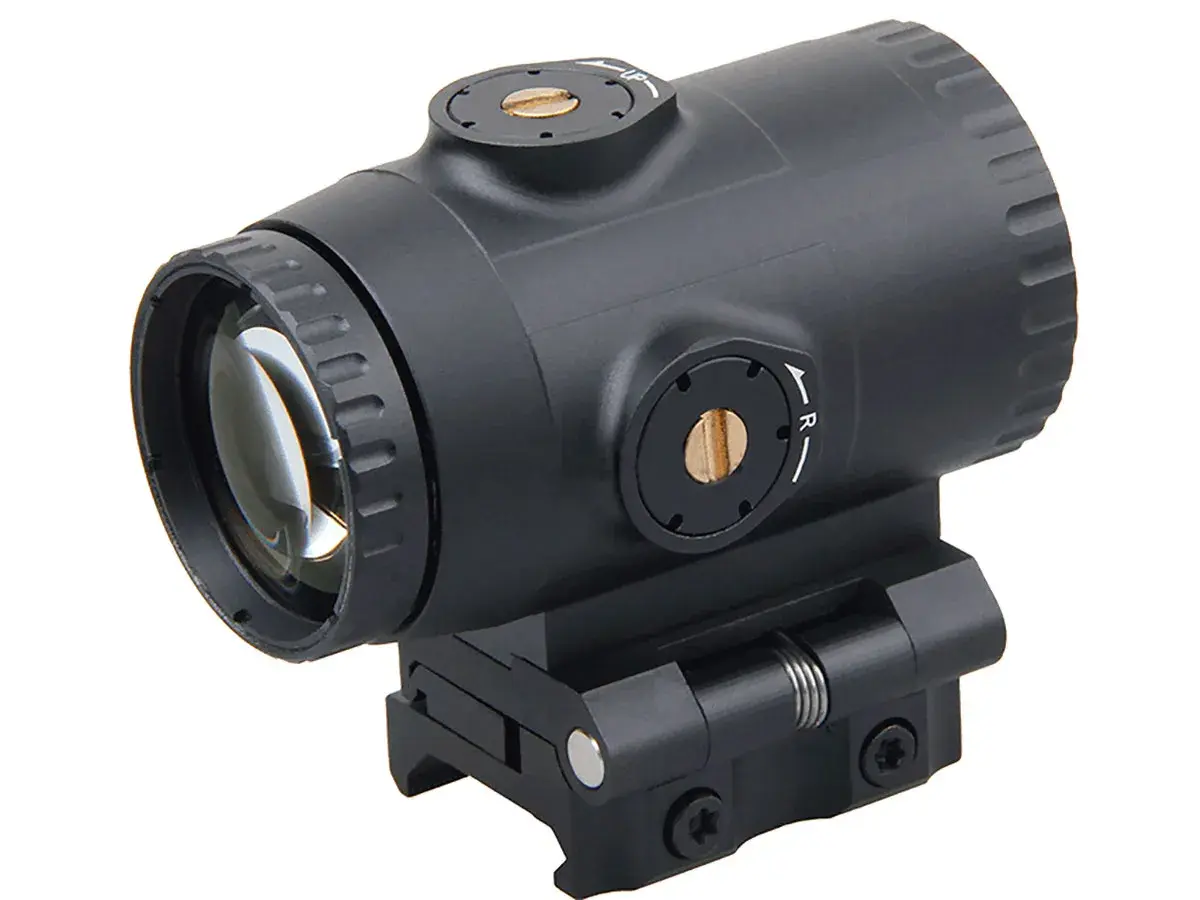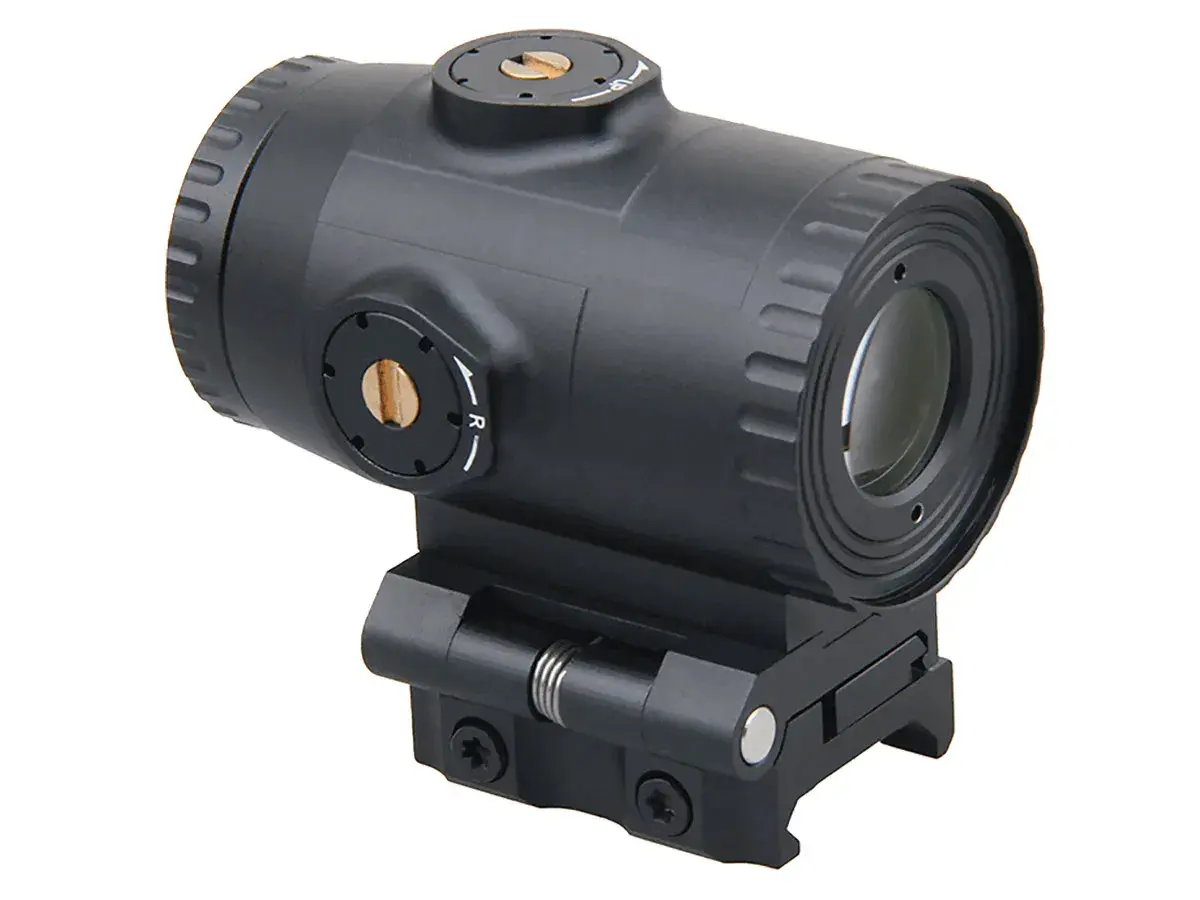 - Увеличитель поставляется с откидным креплением, которое позволяет мгновенно "откидывать" увеличитель в сторону для прицеливания только через сам прицел